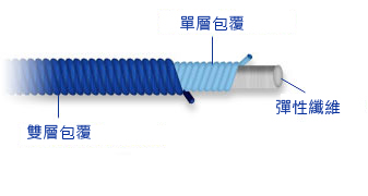 彈性纖維包覆紗是將一般彈性纖維裸紗 (Spandex Bare Yarns) 與各種素材之長纖維絲 (Filament Yarns) 作複合,如特多龍 (Polyester)、尼龍 (Nylon) 等,再與其他纖維交織,能賦予織物無限延伸的空間,使消費者穿著後輕鬆舒適、活動自如。